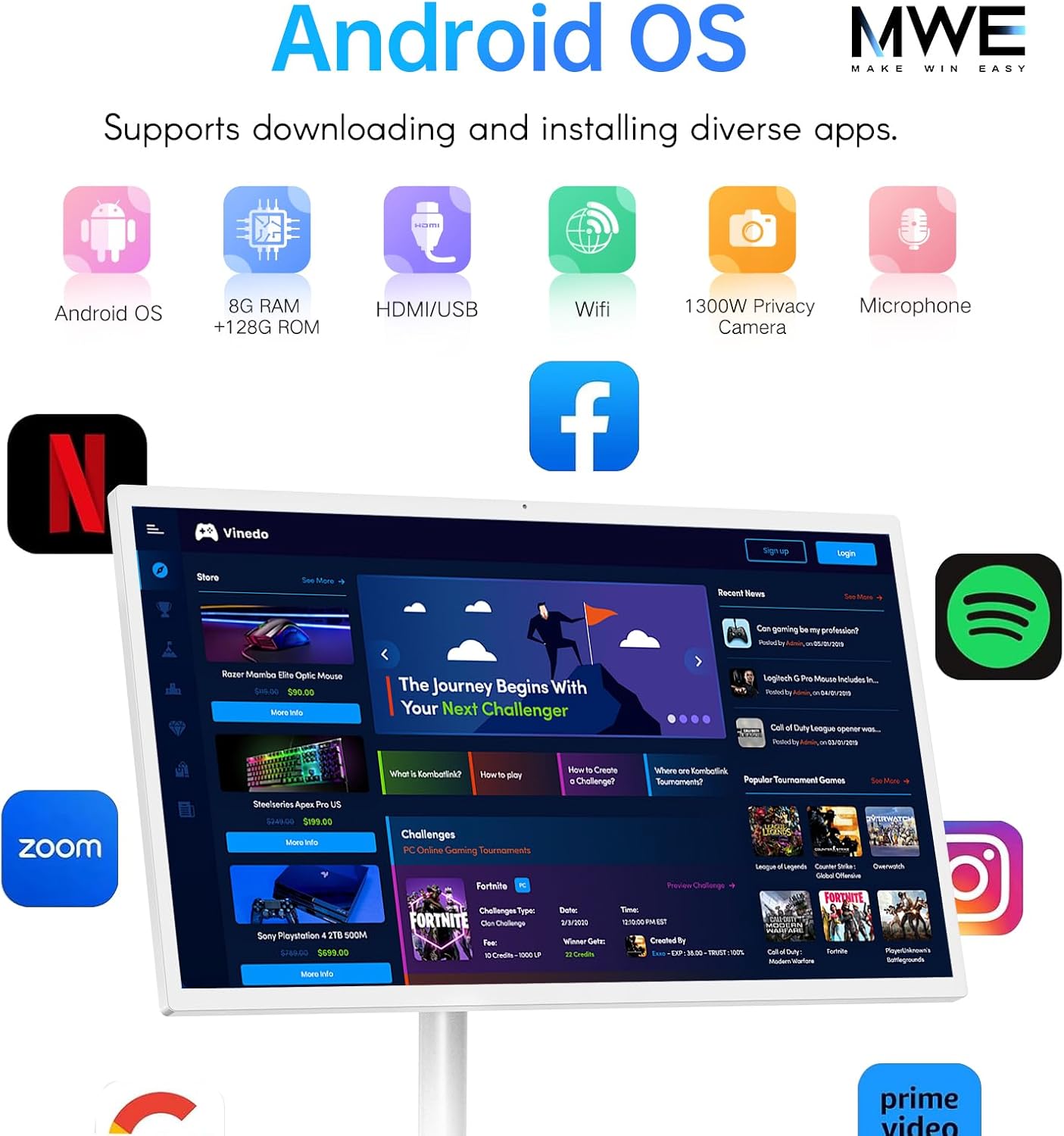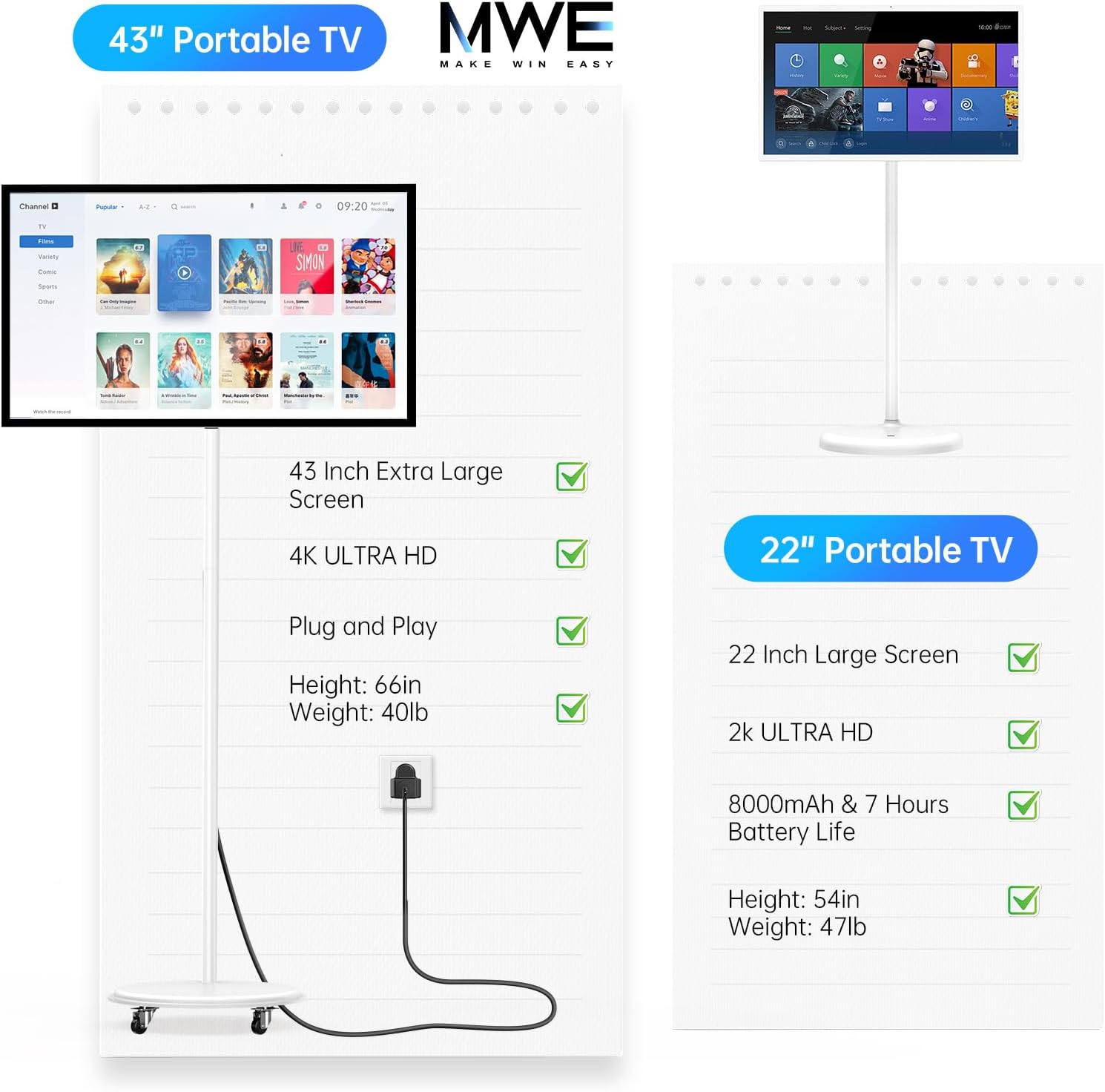[High-definition touch screen]: MWE-OHYEAHSPIN PortableTV features a 22-inch display with a 60Hz refresh rate and a perfect 16:9 aspect ratio. The 10-point capacitive touchscreen offers smooth and precise interaction, making it ideal for all your entertainment and productivity needs.