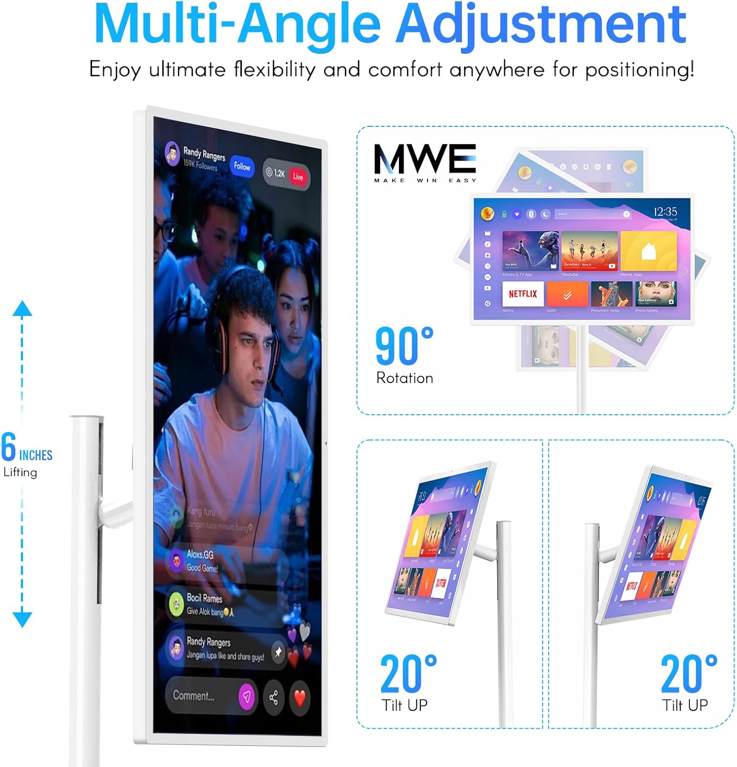 [Wireless Portable Design]:The bottom of the MWE-OHYEAHSPIN Machine is equipped with a wheel, which can be moved freely. Also support rotate 180°, tilt 20°, and adjust up to 10 inches for perfect positioning. Enjoy ultimate flexibility and comfort anywhere!