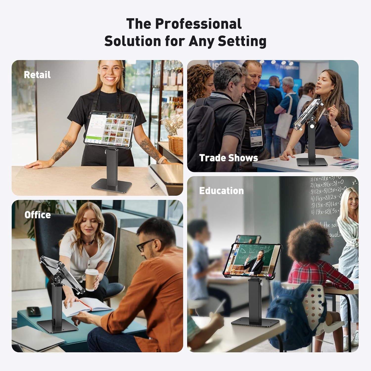 Flexible Viewing with 360° Rotation and Tilt: With 360° rotation and a -90° to 90° tilt range, this ipad kiosk stand offers the perfect viewing angle. Its adjustable height (8.3″–13.4″) makes it ideal for office spaces, and business settings, improving customer interaction and experience.