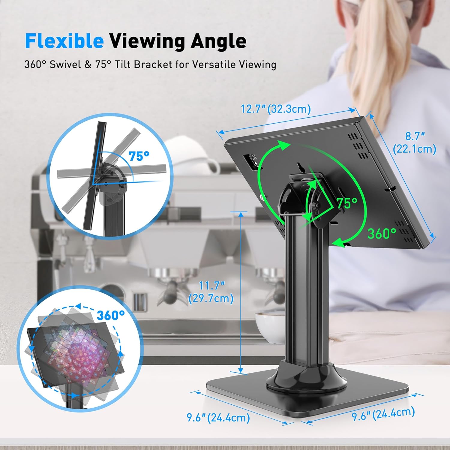 360° rotating location and 75° swivel, this locking stand offers unparalleled convenience for typing or displaying content while ensuring optimal viewing angles