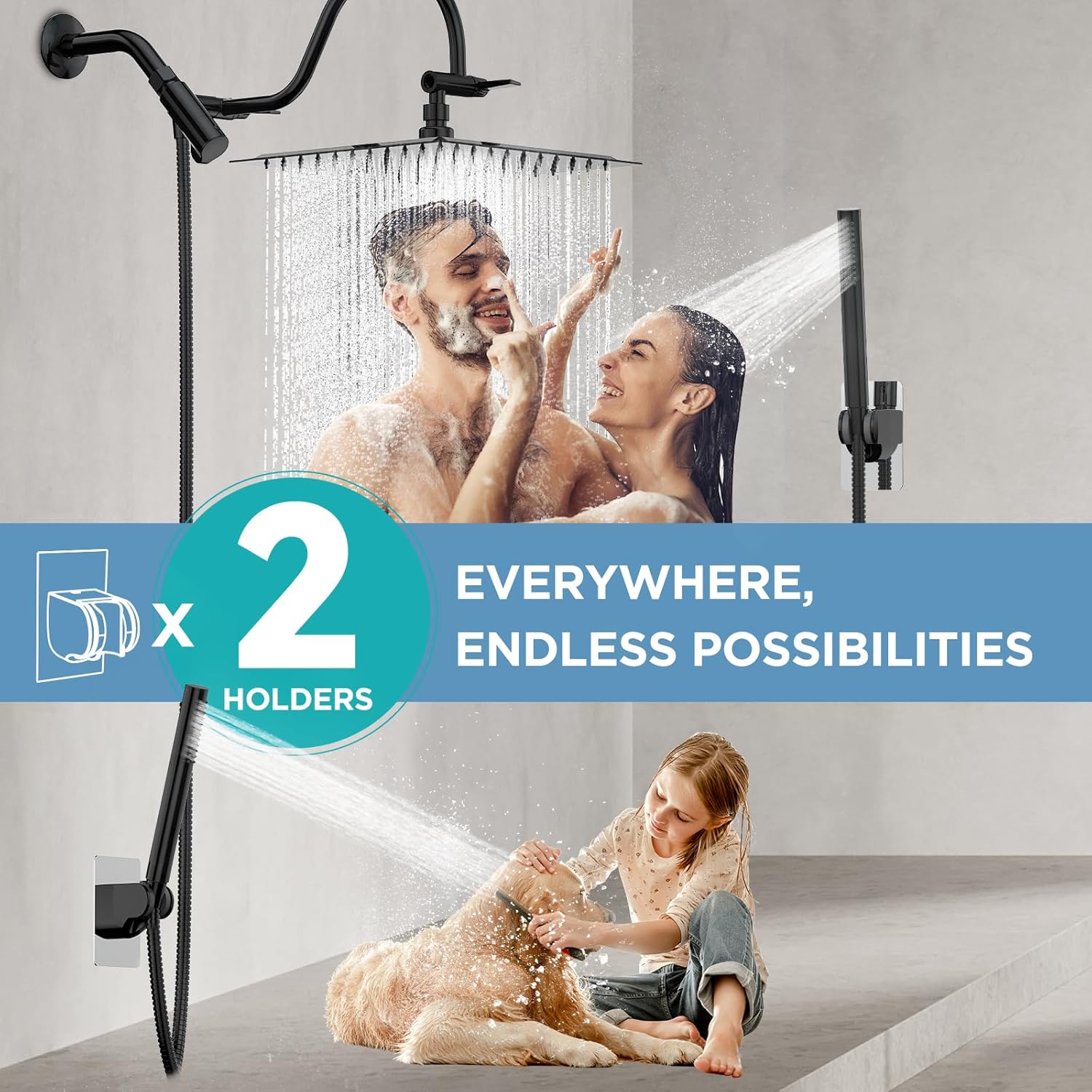8 reviews for All Metal Dual Shower Head Combo with Curved Extension Arm, 10″ High Pressure Rain Shower Head with Handheld Spray, Square Adjustable Rainfall Showerhead System, 71″ Extra Long Shower Hose, Black