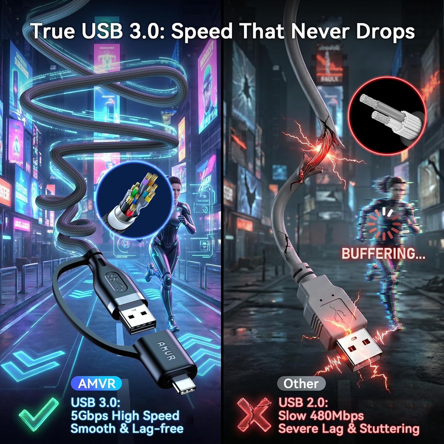 No Data Speed Drop Even When Hard Twisted: The kink-resistant, braided exterior and internal twisted-pair structure work together to prevent performance loss, ensuring consistently stable USB 3.0 data transfer speeds up to 5Gbps through intense bending and daily wear.