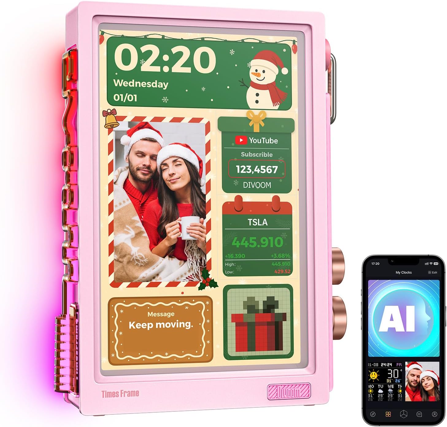 Gift-Ready Smart Frame with Instant “WOW”:Preload photos, notes, countdowns and a custom face before you wrap it. They open the box — it lights up with your message on a floating transparent screen. A truly personal gift for birthdays, anniversaries, long-distance couples, families and creators.Supports AI-generated image creation in different styles.