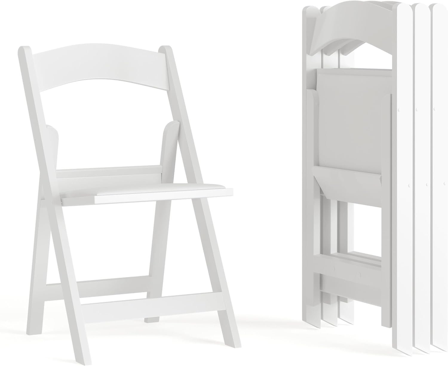 Always be ready for your next event or get-together with this set of 4 heavy-duty folding chairs. Whether you’re hosting a game night or catering event, planning weddings or business meetings, or organizing a school function, these white folding chairs offer a reliable, on-demand seating solution for commercial or home use. The chairs have an ultra-lightweight design and feature protective floor caps that protect flooring surfaces. Durable and stylish, these commercial chairs are constructed from UV-stabilized resin and other premium materials that will withstand years of quality use at indoor or outdoor events, and their upscale design and sleek white color makes them a great option for more formal occasions such as weddings, catered events, or anniversary parties. The waterproof vinyl seats provide superior comfort and support for your guests and can be easily removed and replaced if damaged. These small folding chairs support up to 800 pounds of static weight. Each stack chair measures 17.5″ W x 18″ D x 30.75″ H when open and 17.5″ W x 2.25″ D x 35″ H when folded with no assembly required. The chairs conveniently stack for compact storage after use.
