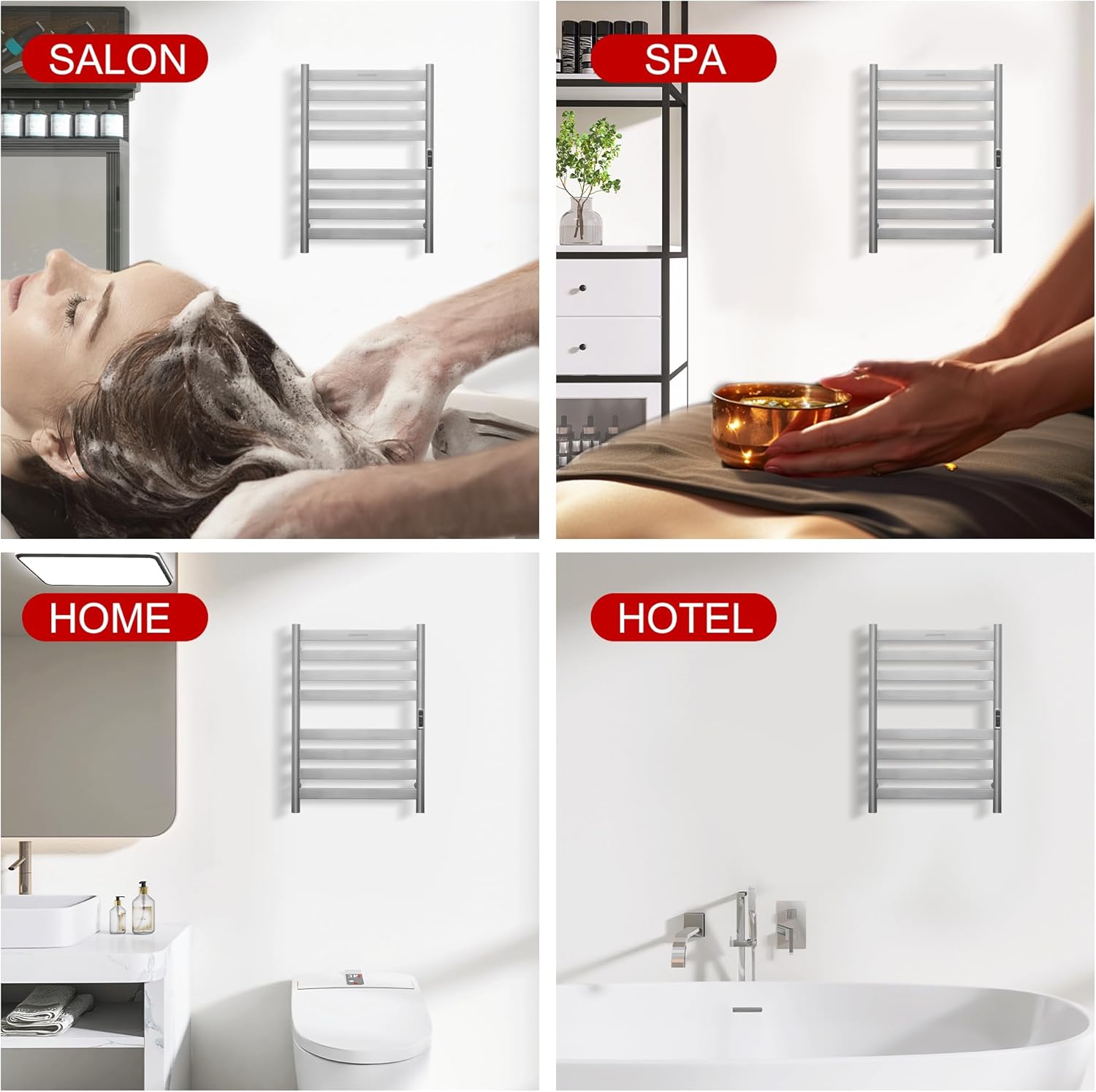 So… I ordered a few styles trying to find the ONE. Round , Square and Flat bar type . As I grew to suspect – flat bars are far superior in every way! Definitely, all models, shape of bars get hot and should be mounted out of reach of small children. Controllers have a lockout feature, so use it if kids with curious fingers are in home. This FLAT BAR warmer has controls that are HIGHER up & harder for kids to reach! This installs EASY ( mounted on stand offs, plug-in, turn on) AGAIN, all have Functioned well & Heat up quite fast. FOR ME -THIS flat bar model WINS !!1) FOR more even heating2) FOR SPEED in DRYING and3) Hands down looks better – IN MY OPINION. It could be the silver, but the flat bars make a big statement to me FEEL modern and it looks higher end to me as well. The controller location is not just better for people with little ones it’s also easier for adults to see and set at this location. Time will tell if it’s more effected by the heat though( I’ve felt they locate the control low to avoid heat damage to the control unit- so we’ll see what happens. Now , I feel its important to say because you really don’t think of it until your using one- that these being called being 8 bar does NOT tranlate to 8 BATH towel capacity. So do not think, “Oh no way, I need an 8 bar. I just need 2..” 🤔Hear me out – For optimal heat coverage, this can warm /dry 2 standard bath towels at once tops! One XL bath sheet. 8 hand towels , 16 or more washcloths, but One bar will NOT warm or dry an entire towel. Because TOWEL materials will not transmit heat along its fibers , however, more bars, heat more length. More bars = More EVEN heat across your large towel, which also means it will dry faster / warm faster and long timers are unnecessary! The flat bars further increase physical contact of the towels/ BAR and IT IS noticeably more effective. Timers that go up to many long hours maybe great for barbers , spas, hotels and other places where warm ,hot & /or steamy towels are an amenity & will be replenished as they are used continuously. SUCH extended timer are largely unnecessary in home use. At home these are great for warming a towel to use as you exit a bath, shower, pool, etc. .. and for drying those same towels completely to keep them from smelling musty, allowing longer reuse! Might be handy when kids have an earache too – ( mom used the oven back in the day- this is definitely safer !) With the controller set to 160° on the round and square warmers I got temps with my laser thermometer ranging from 106° to 176° depending on the exact spot. With this flat bar model, the temps are more even, I was reading 145° – 175°. ( It’s very important to remember 160° can cause 3rd degree burns nearly instantly- so DO be safe! ) ALSO NOTE – ON Fast warm or quick warm The temp does not get this high – still- ALWAYS grab the towels not the bar !! I DO NOT recommend a setting of 160°. ALSO For longer timers you should imo, chose moderate temp – temps like 120-130 which gives a good cushion to avoid burns ( heat rises and some variation across the metal is absolutely normal! Some areas are closer to the heating element -some further.. no doubt its not just a straight line or full coverage. Metal is quite conductive of heat. Heat naturally concentrates in high areas .. so , the variation Is not something I would concider a quality issue.. its just the dynamics of metal, heat, and spatial variance. This flatter bar does distribute heat better i think due to more even distance of the elements inside + reduced empty areas , more uniform thickness of the shape. Again take care of using high temps! This is a plug in unit that requires an outlet within 4 ft. This may be tricky! You may need to install an outlet! Most bathroom outlets are just NOT near large empty wall spaces! Finally -Even though the black ones “match” our oiled bronze better than stainless (arguably), I didn’t feel the black ones looked nearly as good as this one! I think this flat warmer would look nice in any color, but decided to go with silver to see it in our space. I like it & am over the metal matching game, lol, stainless, silver, mirrors , all sort of blend into creating a,l space where this looks natural in the space.. I just need to bring in more of it so it doesn’t stand out. I find it Dries towels enough in 15 minutes. Drying finishes as it cools just like in the drier cool down stage. Very happy with this ! Would, can, do recommend.