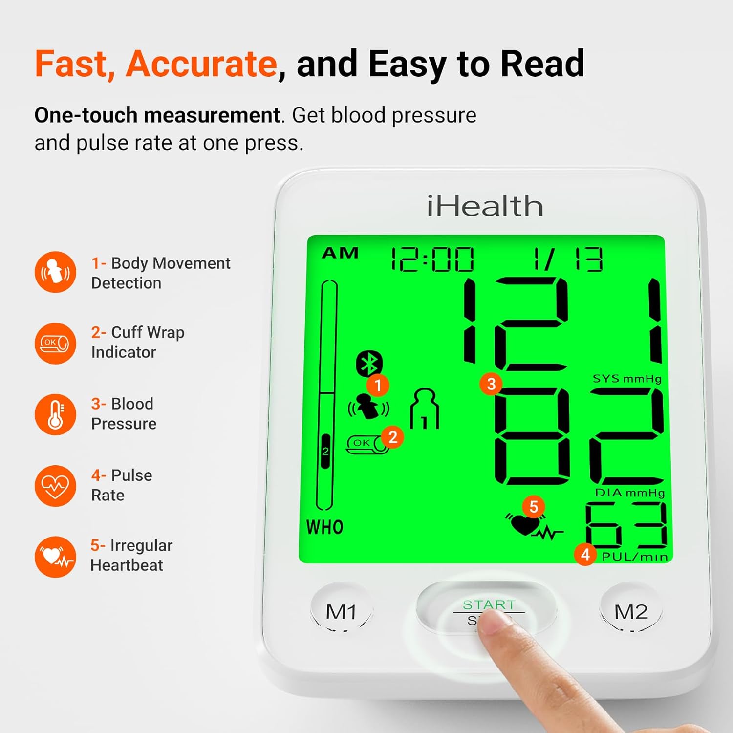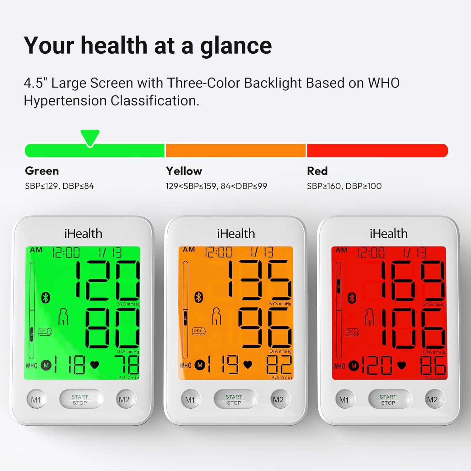 Understand Results Instantly: WHO-based tri-color backlight (green / yellow / red) shows blood pressure level at a glance—no medical knowledge needed. Built-in irregular heartbeat detection alerts abnormal heart rhythm.