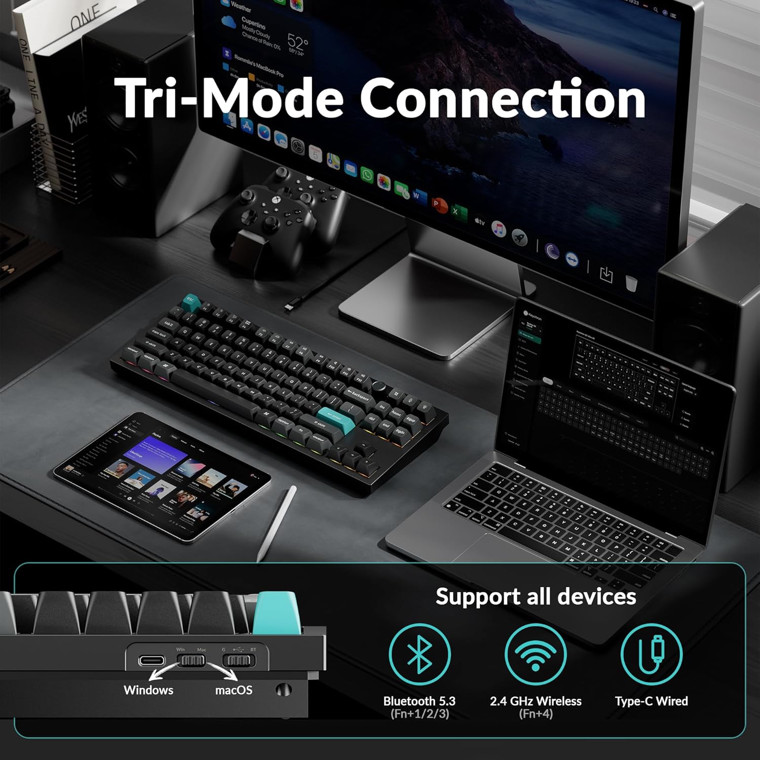 Wireless 8K Gaming Performance: The Keychron Q3 Ultra delivers a groundbreaking 8000 Hz polling rate in 2.4 GHz wireless and wired modes, with near-zero latency. Seamlessly switch devices via Bluetooth 5.3 for responsive multitasking among macOS, Windows or Linux systems (Mac and Windows keycaps are included).