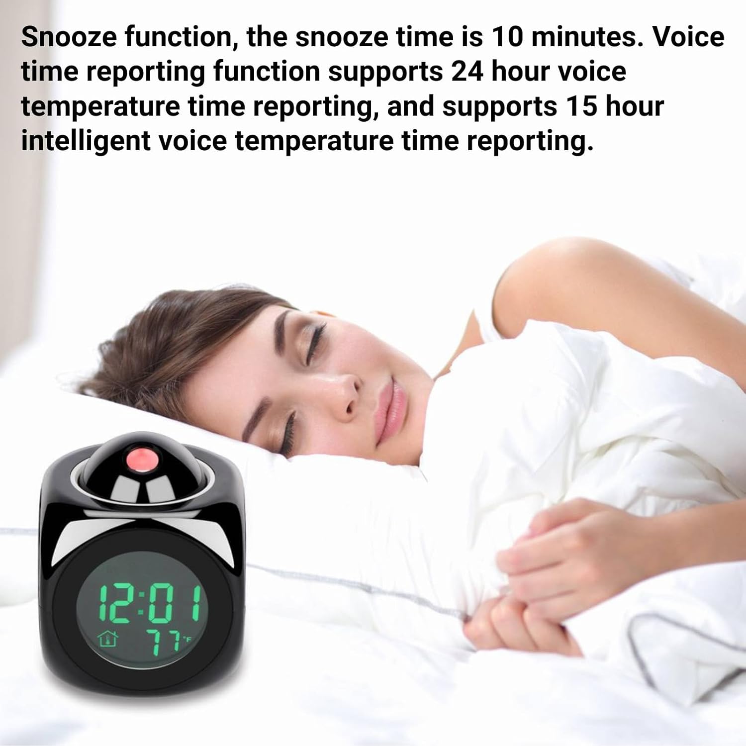 Mutifunctions: Indoor temperature display and the temperature unit can be switched to C or F. Snooze function, the snooze time is 10 minutes. Voice time reporting function supports 24 hour voice temperature time reporting, and supports 15 hour intelligent voice temperature time reporting.
