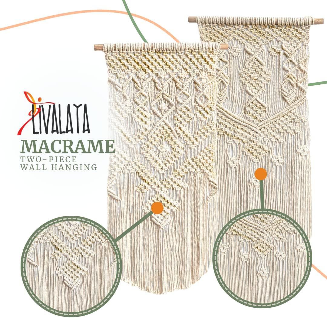LIVALAYA Boho Macrame Wall Hanging Woven Decor, 24”L x 13”W, Set of 2, Beige wall decor Modern Bohemian Farmhouse woven wall hangings for House Apartment Dorm Room, Nursery, Geometric Aztec Décor