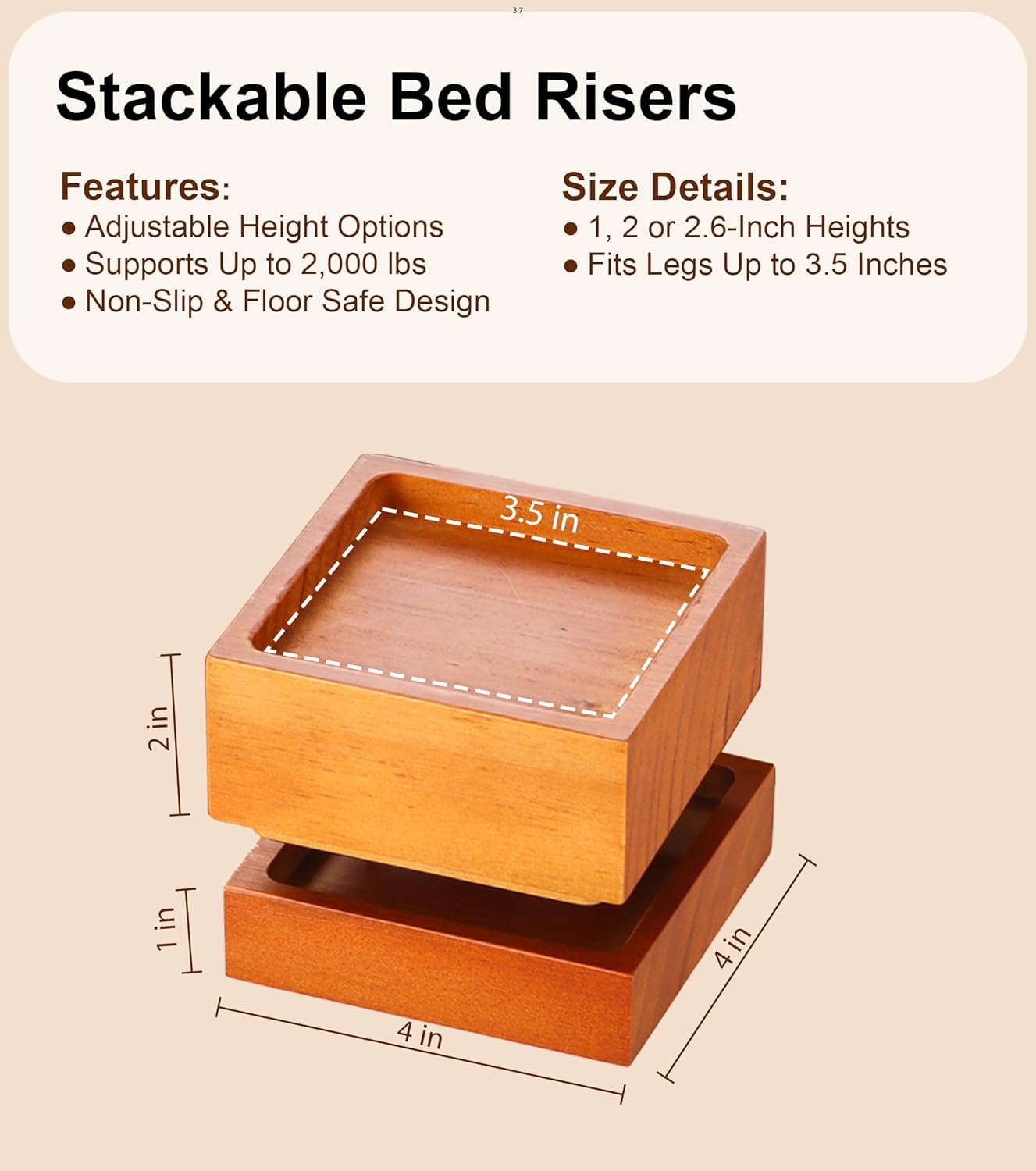 Robust and Secure Support: Engineered to support up to 2,000 pounds, these risers provide exceptional stability and safety for your furniture. The solid pine wood construction ensures reliable support, while the non-slip felt pads on the bottom of each riser prevent unwanted movement and keep your furniture securely in place. This robust design guarantees that your furniture remains steady, offering peace of mind and enhancing the overall stability and safety of your living environment.