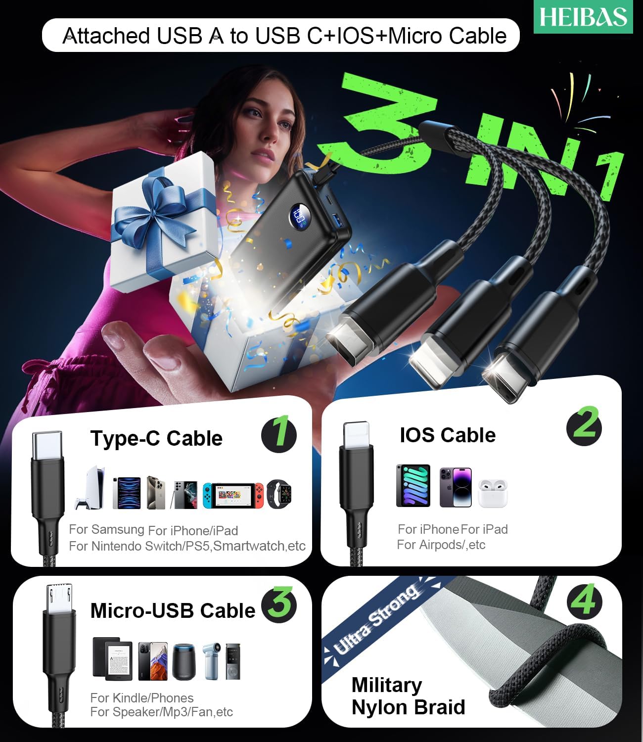 [Charge 5 Devices at Once]: Includes a 3-in-1 cable (USB-C, Lightning, Micro USB)—industrial-grade nylon-braided for tough durability and fray resistance. This versatile 3-in-1 cable is the key to the HEIBAS battery pack charging 5 devices simultaneously: phone, tablet, game console, headphones, even a fan. Essential for camping, travel, festivals, and multi-gadget homes!