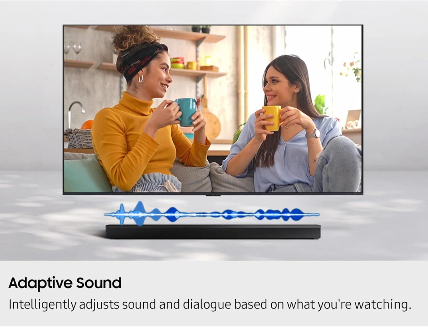 Designed to work seamlessly with compatible Samsung TVs, Q-Symphony allows the TV speakers and soundbar to operate together, expanding the soundstage for richer, more detailed audio. Adaptive Sound intelligently analyzes content in real time and optimizes audio output, ensuring clear dialogue during quiet scenes and impactful sound during action-packed moments.