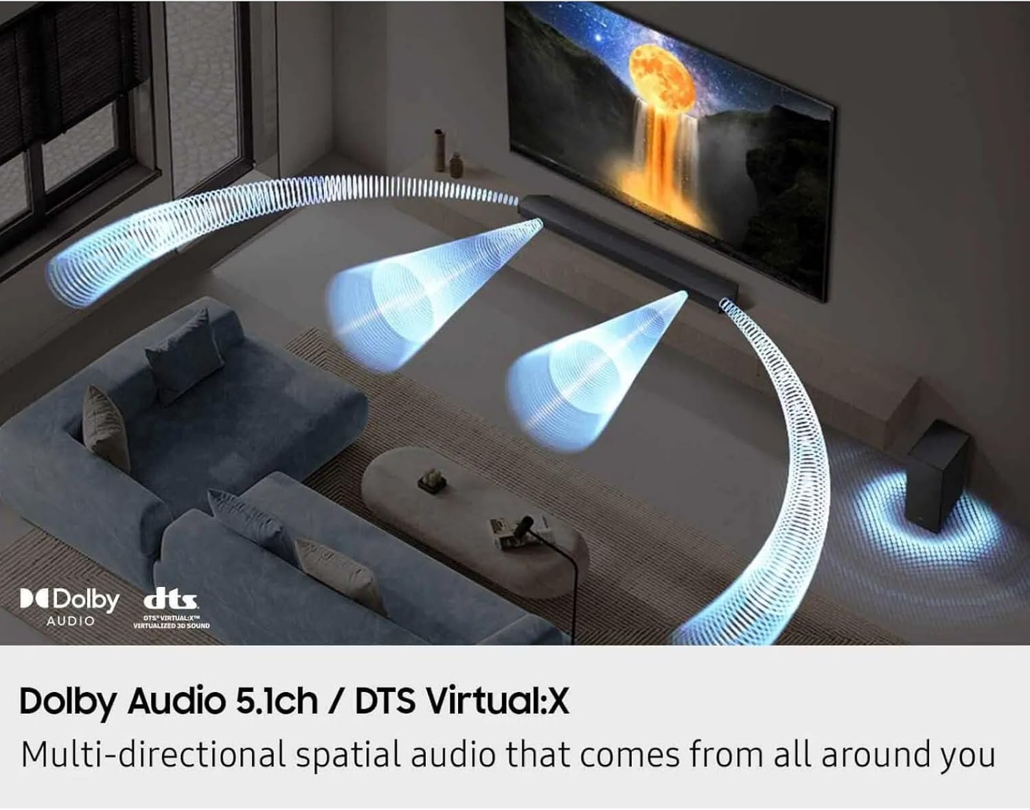 Dolby Audio 5.1 & DTS Virtual:X – Advanced audio technologies create a virtual 3D surround effect, adding height and depth to sound without requiring additional rear speakers.