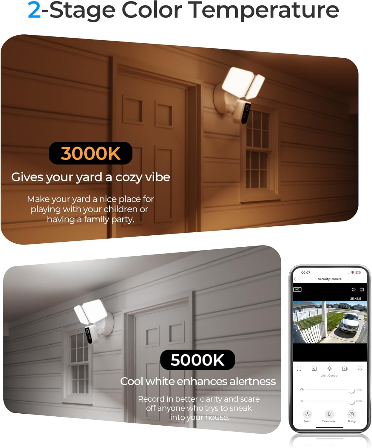 2K HD & Color Night Vision Floodlight Camera: See more with 2K ultra-clear resolution and full-color night vision. This floodlight camera outdoor captures sharp images even in low-light conditions—perfect for driveways, front doors, and backyards.