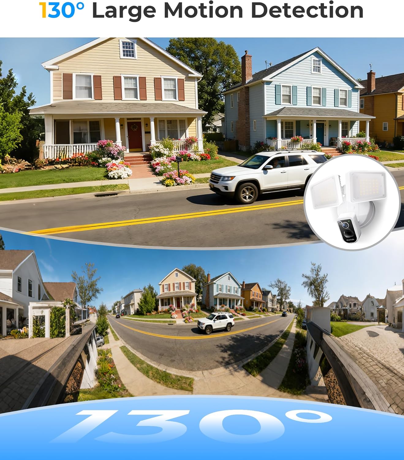 Adjustable Floodlight Camera & Light Panel: Unlike fixed designs, both the floodlight camera and LED floodlight panels are angle-adjustable, allowing you to eliminate blind spots. With smart positioning, even the 130° motion detection angle can be optimized to achieve near 360° real-world coverage.