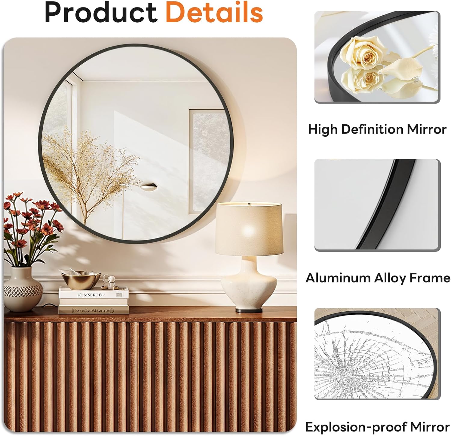 👍 Sleek Black Metal Frame: Crafted with a durable aluminum alloy frame, this black round mirror is rust-resistant, waterproof, and built to last. The modern brushed design adds a sophisticated accent to bathrooms, bedrooms, or living areas.