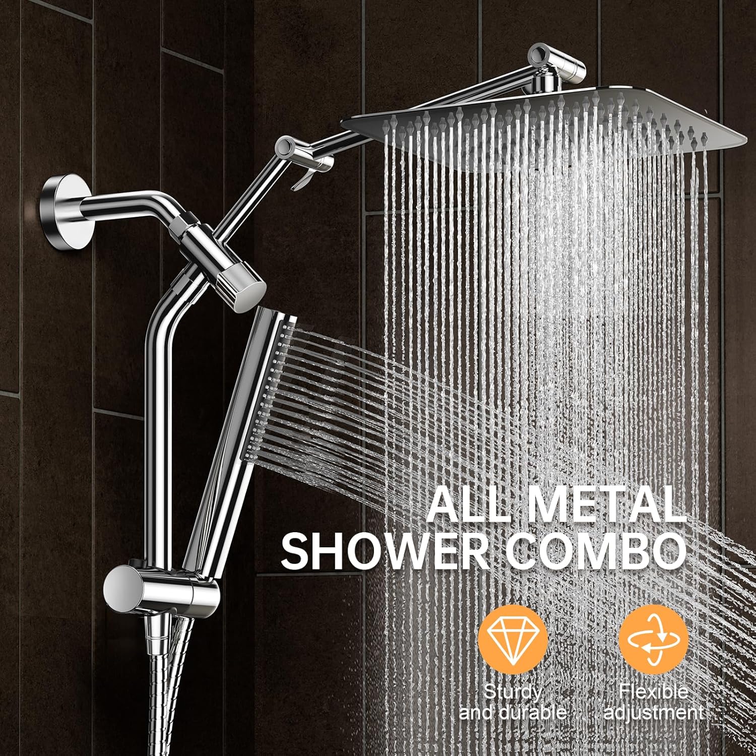 Veken All Metal 10″ Shower Head with Handheld, Luxurious Square High Pressure Double Rain Shower Heads with Spray Combo, Dual Detachable Rainfall Showerhead with Extension Arm, Long Hose,Chrome,Sliver