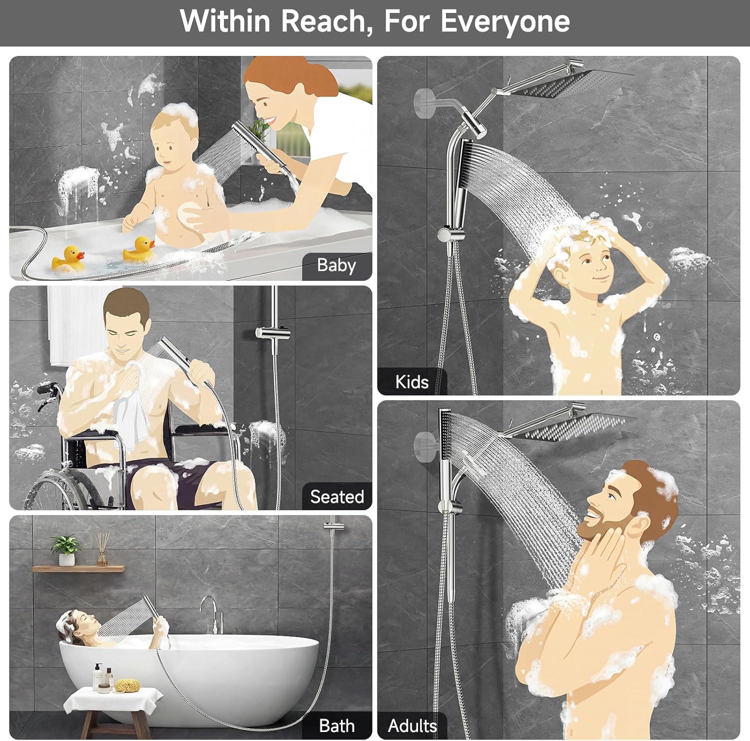Power Wash Cleaning, Made for More Situation: Built-in power jet on the handheld sprayer helps rinse away soap scum and reach tight corners around the tub and tile. A 13-inch slide bar and 60-inch hose ensure full reach with no missed spots, making daily showering easier for seniors, seated use, and pet bathing.