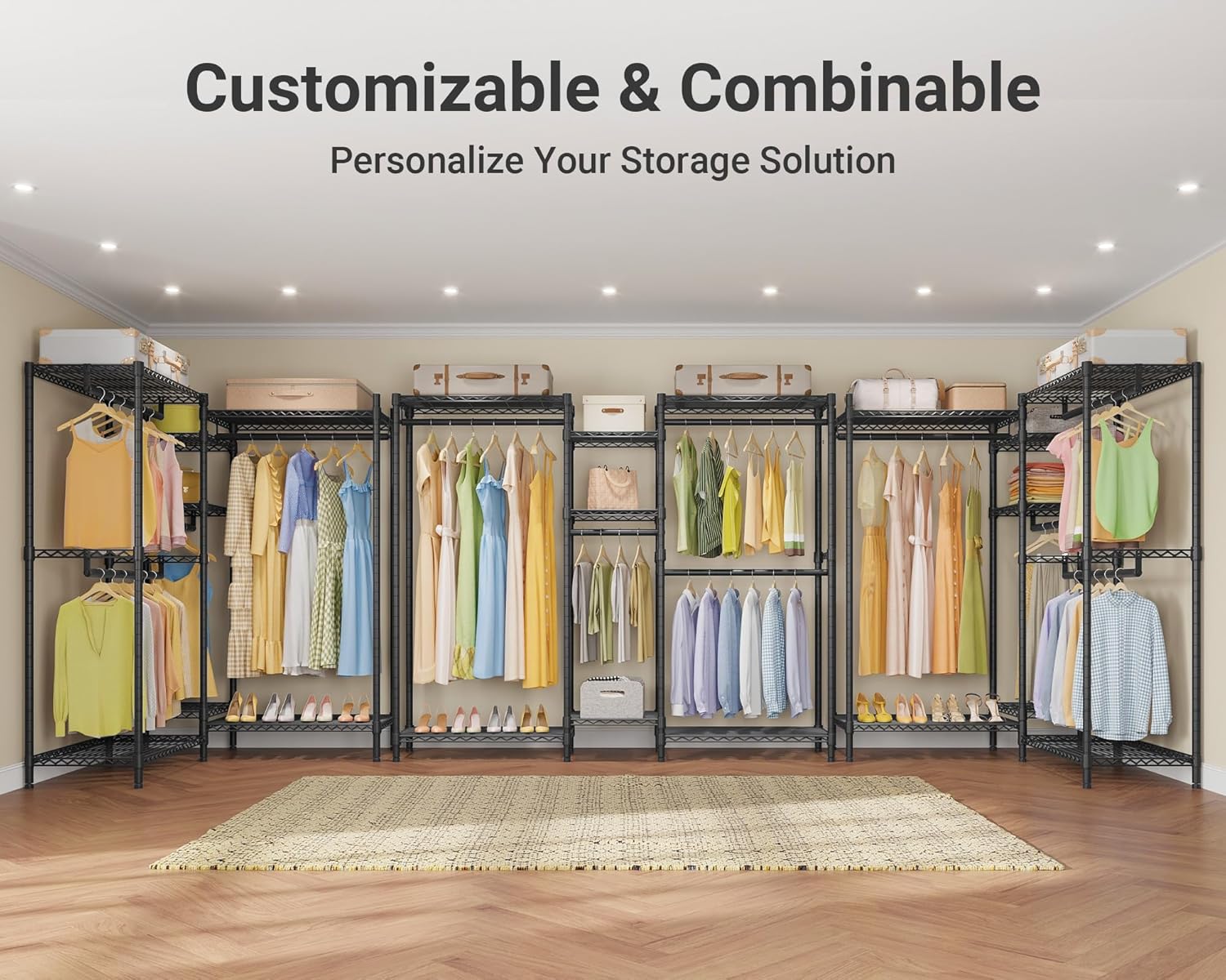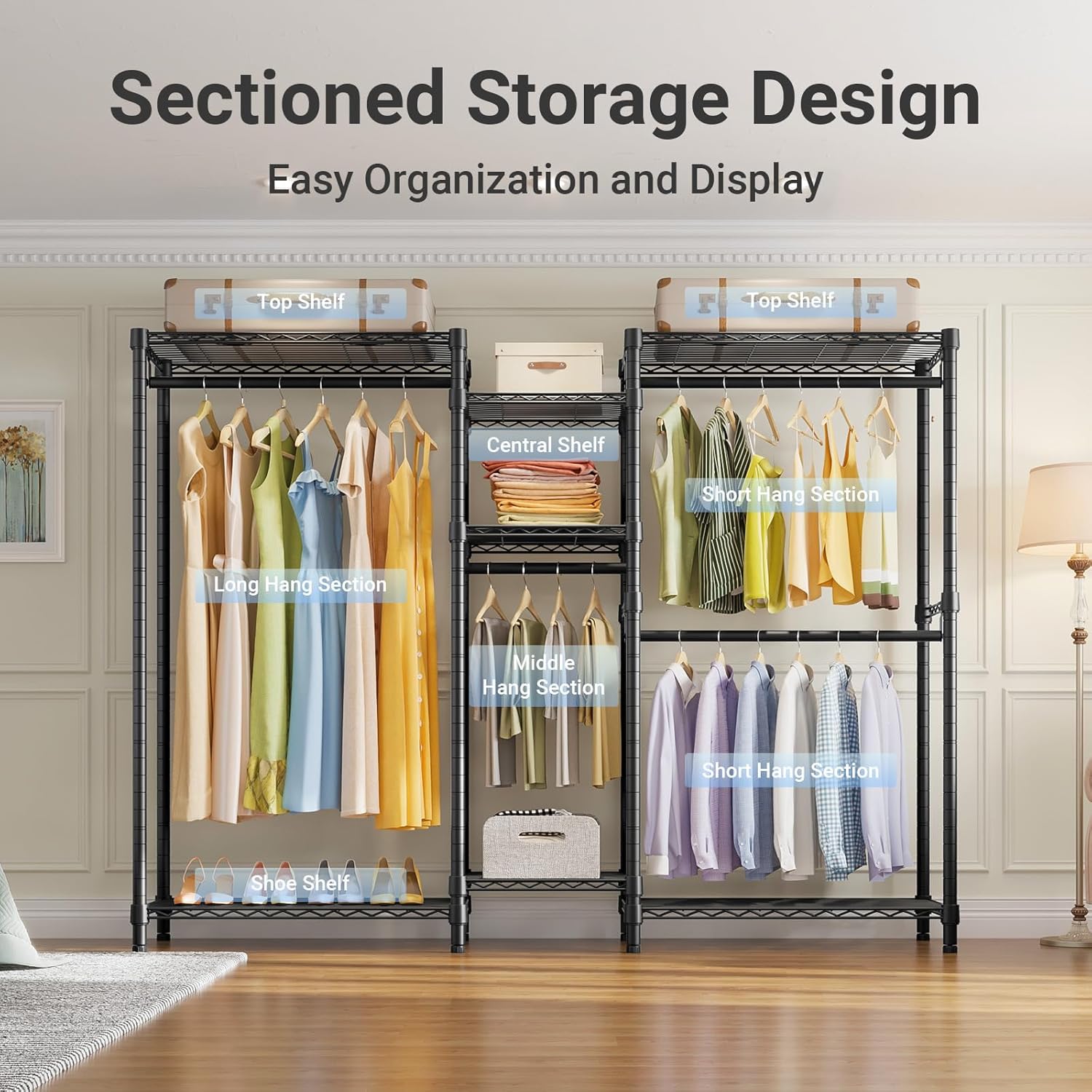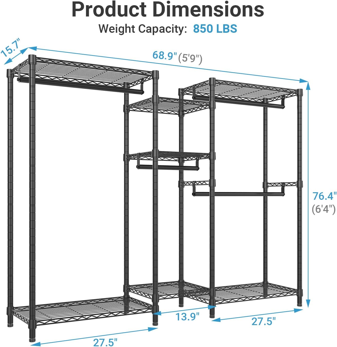 850 lb Weight Capacity — The heavy duty clothing rack supports your storage needs effortlessly without bending or sagging. Ideal as a closet wardrobe, closet storage system, or free standing closet system for bedrooms and walk-in closets