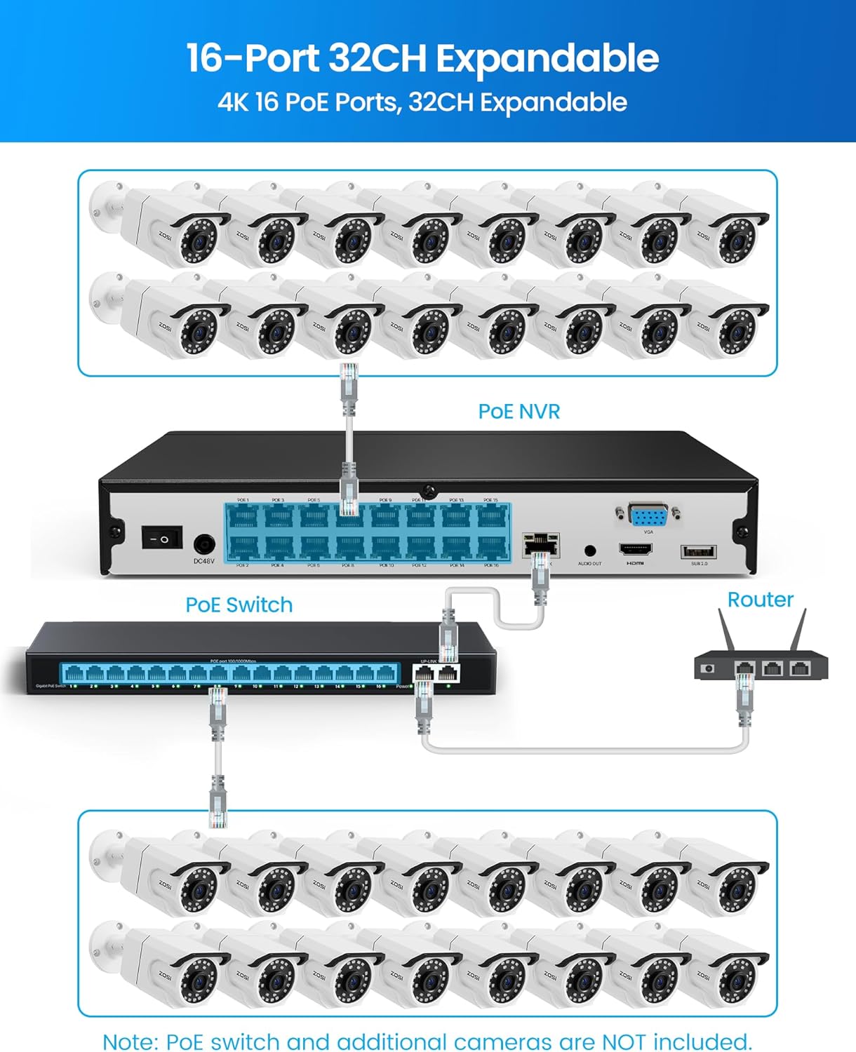 [16 PoE Ports, Expandable to 32 Cameras]- Scalable for Large Properties: Start with 16pcs 4K cameras and expand up to 32 with an additional PoE switch (supports ZOSI 8MP/5MP cameras).Plug-and-Play Setup: Includes PoE cables for easy installation—no extra wiring needed.